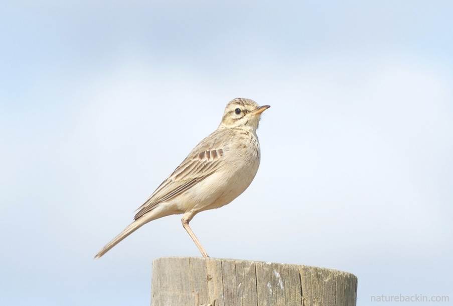 Another photo of the pipit, which like the stonechat is mostly insectivorous. When I first saw this bird, I assumed it to be a lark, but later, looking online, I came across a very useful page (by Faansie Peacock) with an illustration detailing the main distinctions between pipits and larks. Noting the slender uncurved bill, the single row of scapulars and the relatively long tibia, I think it is a pipit, and most likely the African pipit.