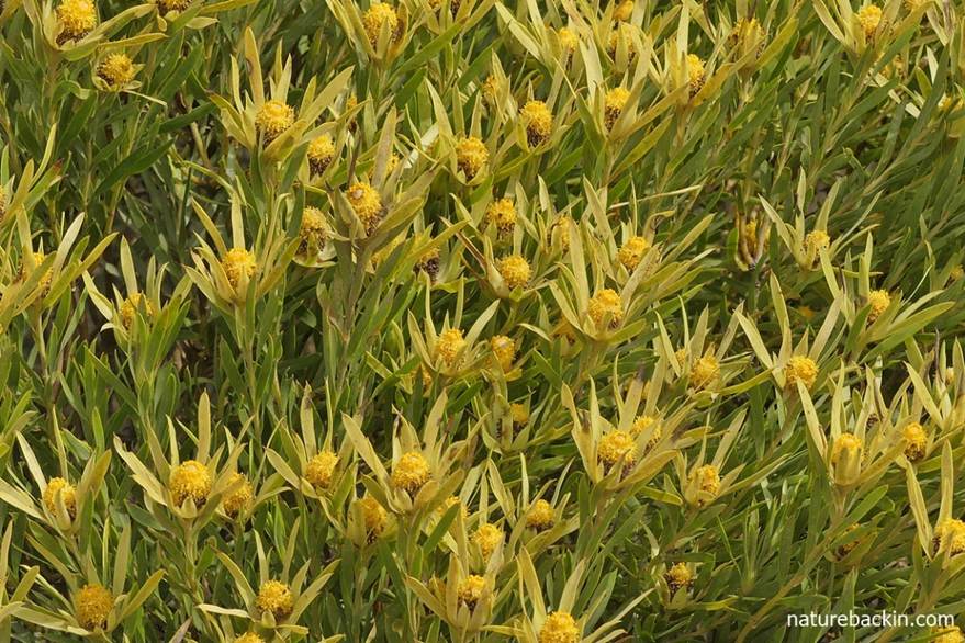 Several species of conebushes or Leucodendrons form bold splashes of colour in amongst the fynbos vegetation. The cone-shaped flowers/fruit are surrounded by colourful bracts, with many species being yellow.  Conebushes have separate male and female plants. As there over 80 species of Leucodendrons in South Africa, and they are notoriously difficult to identify, I should not even try to identify the plant in the above photograph. However, because they occur in the region, and the leaves are narrow, slightly curved and have a small point at the end, I think it may possibly be a sickle-leaf conebush (Leucadendron xanthoconys).