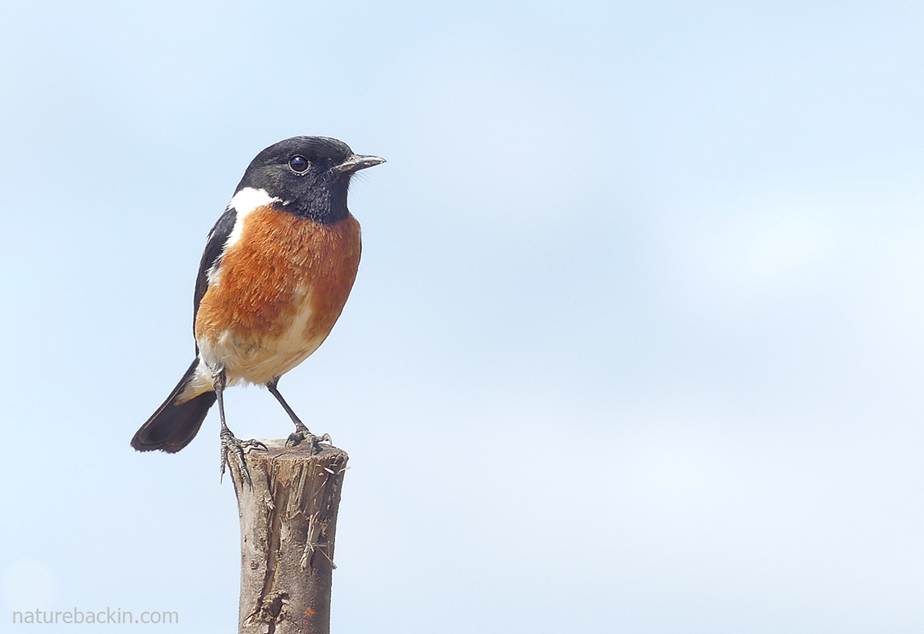 Also perched on a post was an African stonechat (Saxicola torquatus). These little birds are mostly insectivorous, but they are also known to eat small lizards, seeds and fruit.