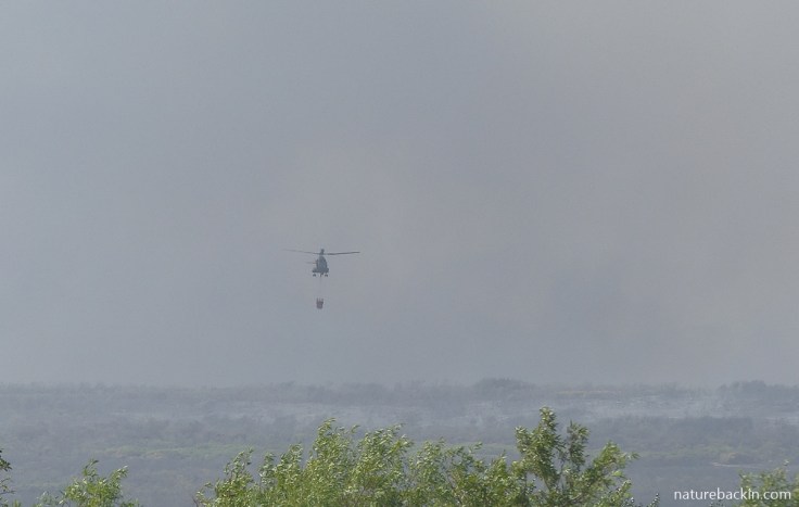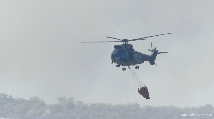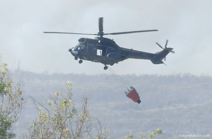 On the morning of 10th January, a large army Oryx helicopter joined in the aerial water bombardment of the fire along the main road to Gansbaai and De Kelders, which was closed. The Oryx and the smaller Working on Fire helicopter were repeatedly filling their water buckets from the small Willem Appel Dam in Stanford. The unsettling sound of the beating of the helicopter blades had become an accompaniment to the fires that was simultaneously reassuring and unsettling in anxious times.