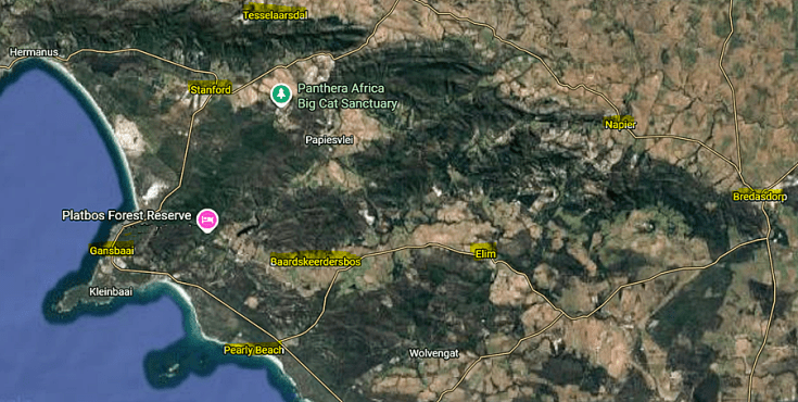 Map of the region highlighting some of the places where fires occurred in late 2025 and January 2026, including Stanford and Gansbaai, from Google Maps. (See here)