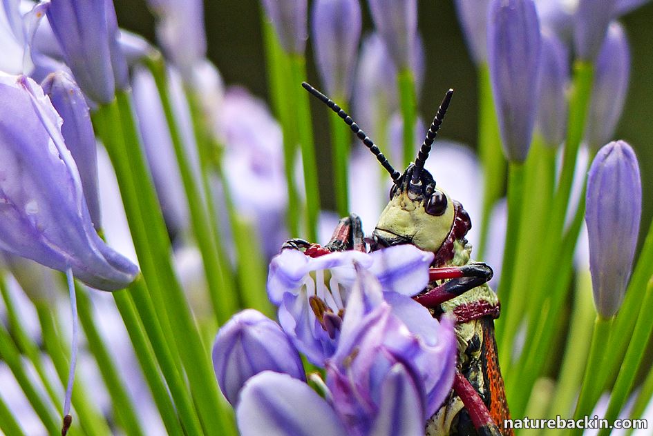This gaudy grasshopper is spectacular enough on its own, but peeking over the petals of an agapanthus flower it made quite a show. Continue reading “Peek performance”